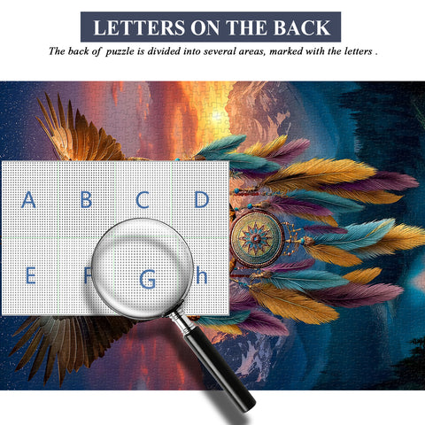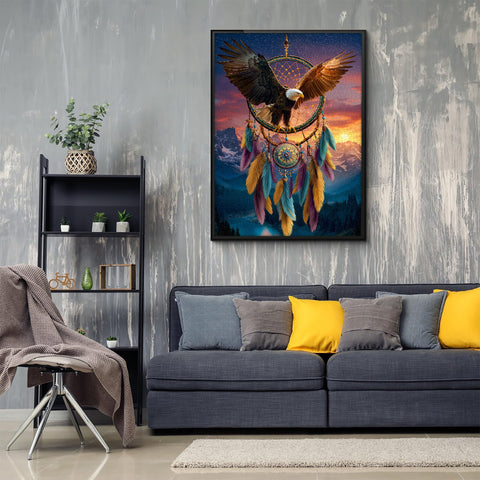 🦅✨【Eagle Dreamcatcher Jigsaw Puzzle】: Under a sky tinged with the golden hues of a sunset, an eagle with outstretched wings soars from the center of a giant dreamcatcher. Its wings, bathed in light and shadow, intertwine power and spirit; colorful feathers, intricately woven rope loops, and shimmering beads. Every element symbolizes protection, freedom, and hope.