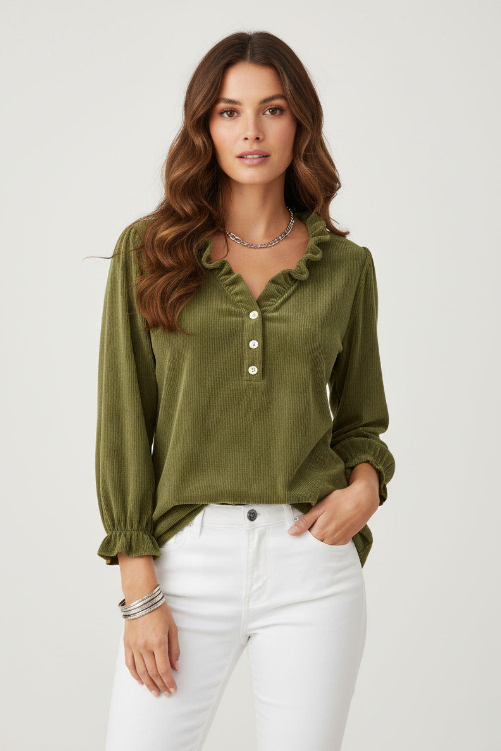 Step into refined style with the Ruffle-Collared Shirt — a beautifully tailored piece designed to elevate your daily wardrobe. With its delicate ruffle details, flattering fitted silhouette, and timeless V-neckline, this shirt brings sophistication to any casual look. Perfect for work, weekends, or polished day-to-day outfits.